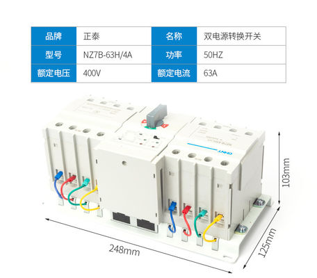 50Hz AC güç frekansına, AC400V nominal çalışma voltajına ve 63A nominal çalışma akımına sahip üç fazlı dört hatlı iki devreli güç kaynağı şebekesine uygulanabilir, NZ7B serisi otomatik transfer anahtarlama ekipmanı otomatik olarak bir veya birkaç yükü bağlayabilir Yük devresinin normal güç beslemesini sağlamak için bir güç kaynağından diğerine.